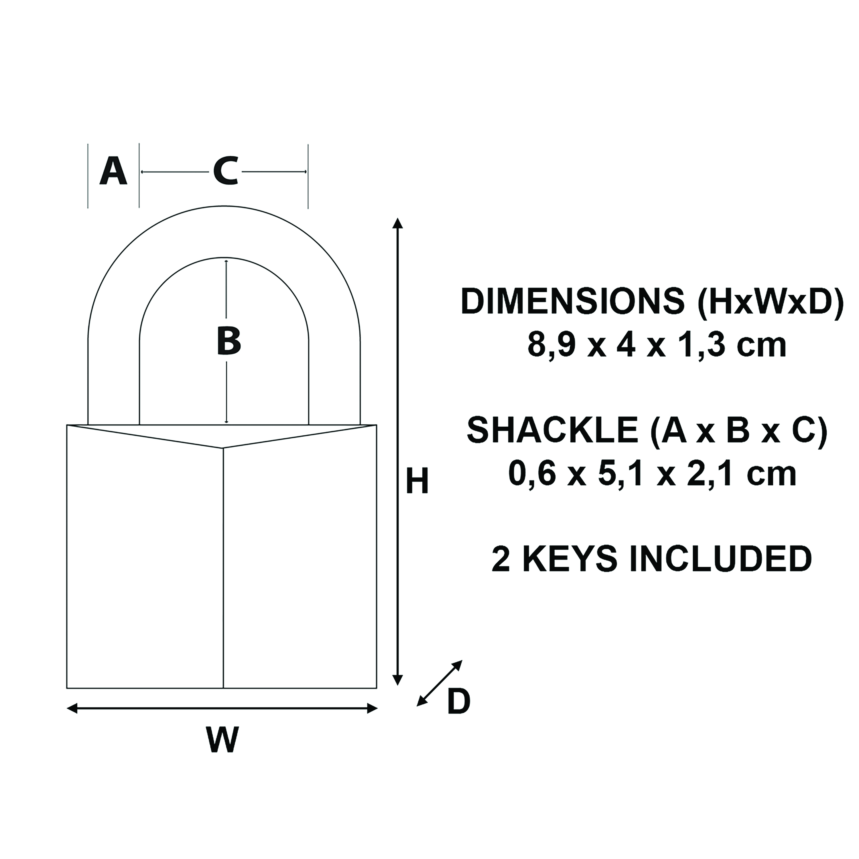 • Dimensions Padlock (HxWxD): 8.9 x 4 x 1.3cm