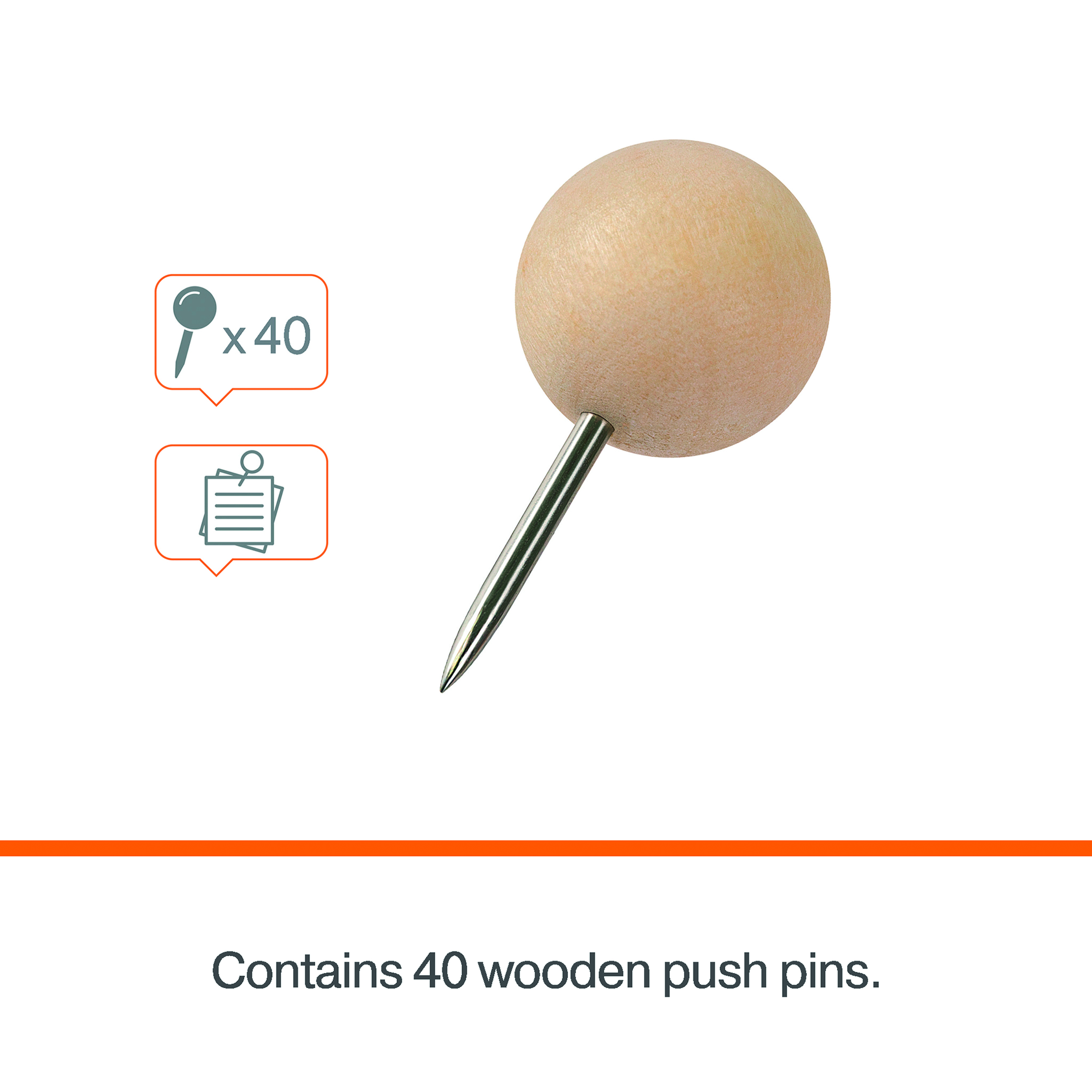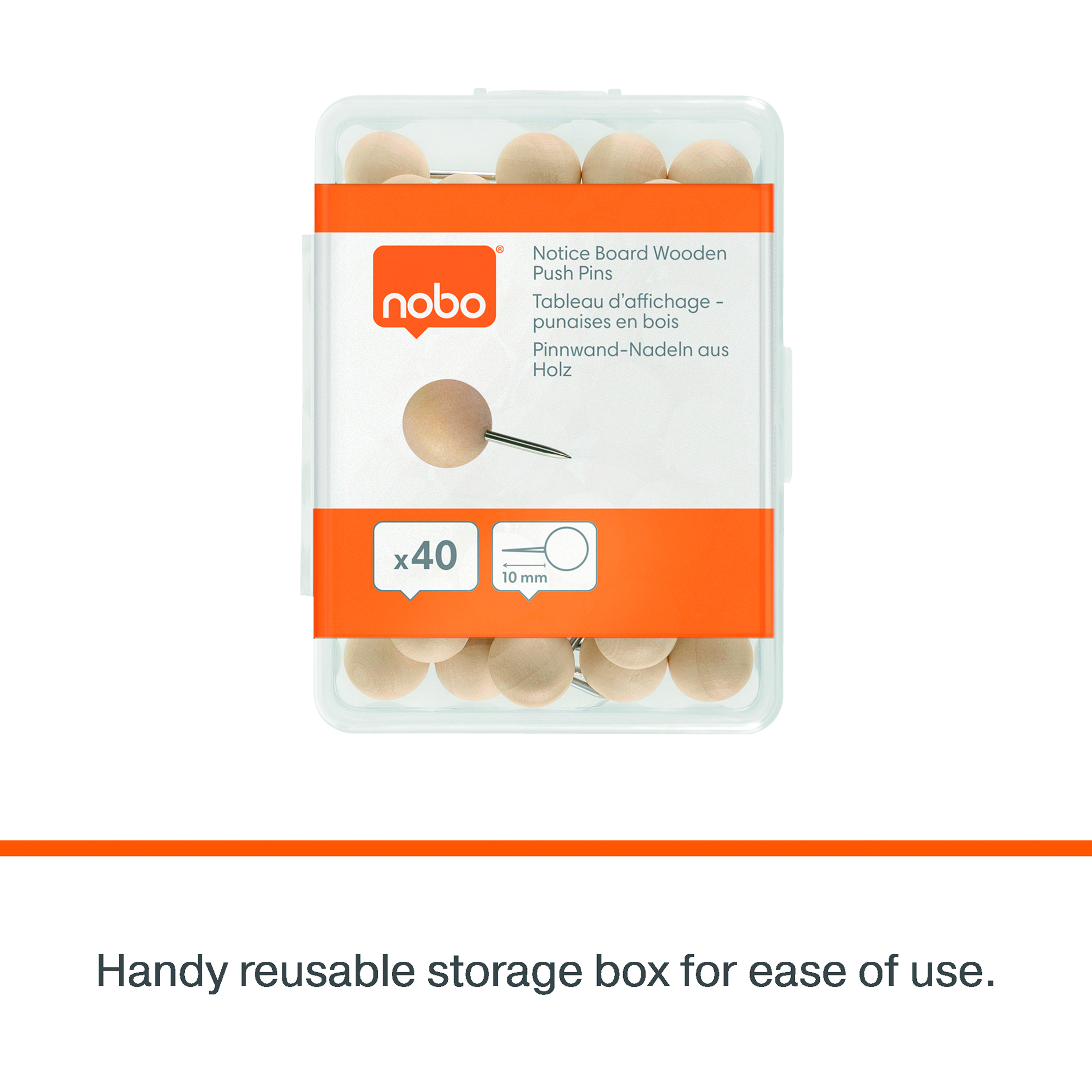 Wooden push pins for use on cork and felt notice board surfaces are an essential addition to the workplace. These push in pins help with organisation by displaying notices, important notes and reminders quickly and securely. With a modern round wooden design, each pack contains 40 push pins, stored in a handy reusable storage box, perfect for offices, schools and home offices. For optimal performance, use with a Nobo notice board.